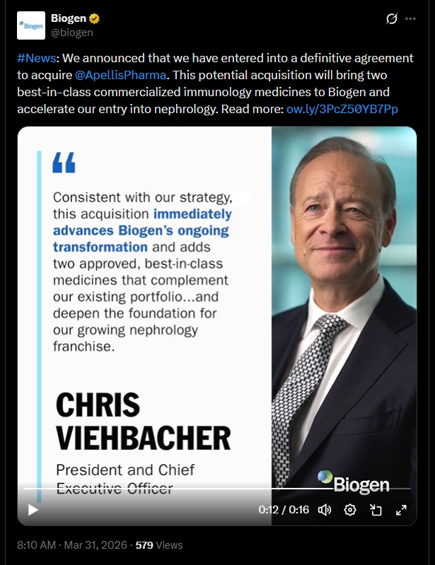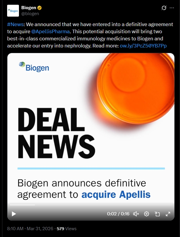 of Merger, dated as of March 31, 2026, by and among Biogen, Purchaser and Apellis.